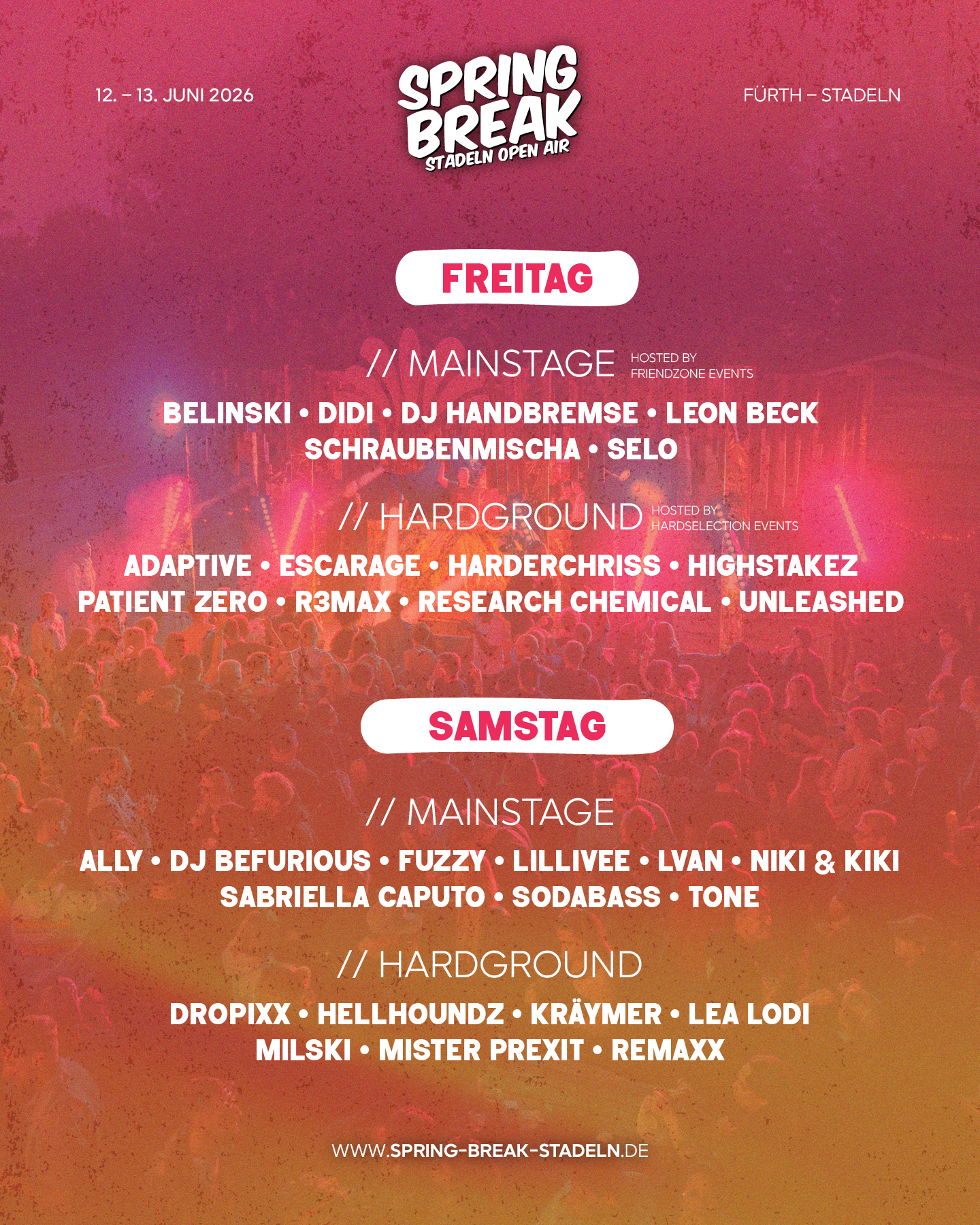 Der Spring Break Stadeln e.V. besteht aus rund 30 jungen Erwachsenen und ist im Jugendzentrum Hüttn in Fürth-Stadeln zuhause. Unser Ziel ist es Fürth ein wenig bunter zu machen und mit dem Spring Break Stadeln Open Air und weiteren unterm Jahr verstreuten Aktionen, Raum für das Ausleben von Kunst und Kultur zu schaffen. Mit einem Anteil von knapp 50% des Lineups für Newcomer, möchten wir außerdem die jungen Talente aus der Region fördern und die Chance geben auf einem Festival zu spielen, wie es sonst vielleicht nicht so schnell möglich wäre.